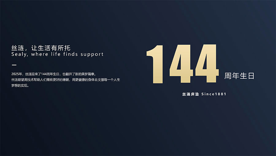 絲漣SEALY1881年誕生于美國,自1885年第一張絲漣床墊問世伊始,便憑借其卓越性能與舒適安睡體驗聲名大噪。1950年,絲漣開創(chuàng)床墊與醫(yī)學(xué)權(quán)威共研的先河,絲漣美姿以科學(xué)的脊柱支撐理念徹底重塑了床墊行業(yè)。75年來,持續(xù)的技術(shù)升級和創(chuàng)新使得美姿彈簧不斷進(jìn)化,只為打造更加舒適健康的睡眠體驗。
