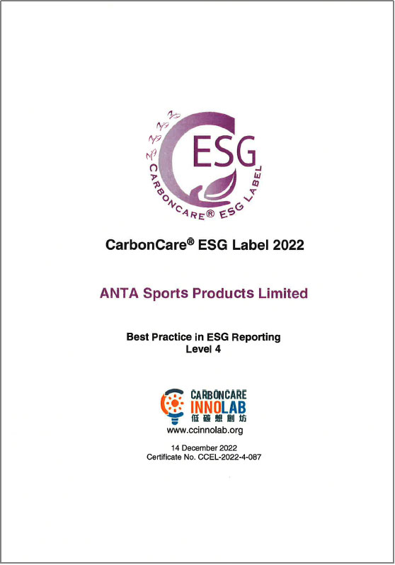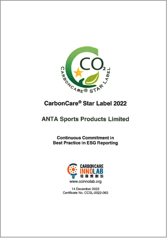 此外,安踏集團于低碳想創坊(Carbon Care Innovation Lab)中獲頒「ESG報告最佳匯報實踐第四級」,較去年提升兩級,反映集團ESG報告表現優異,在公司董事局的問責度、實質性評估、社會關鍵績效指標的披露,以及企業氣候行動的努力亦得到外界的認可。安踏集團曾于過往連續三年成功取得「低碳關懷標簽」,因此本年度獲額外頒發「低碳關懷星級標簽」,以表彰過往在ESG方面的成果。